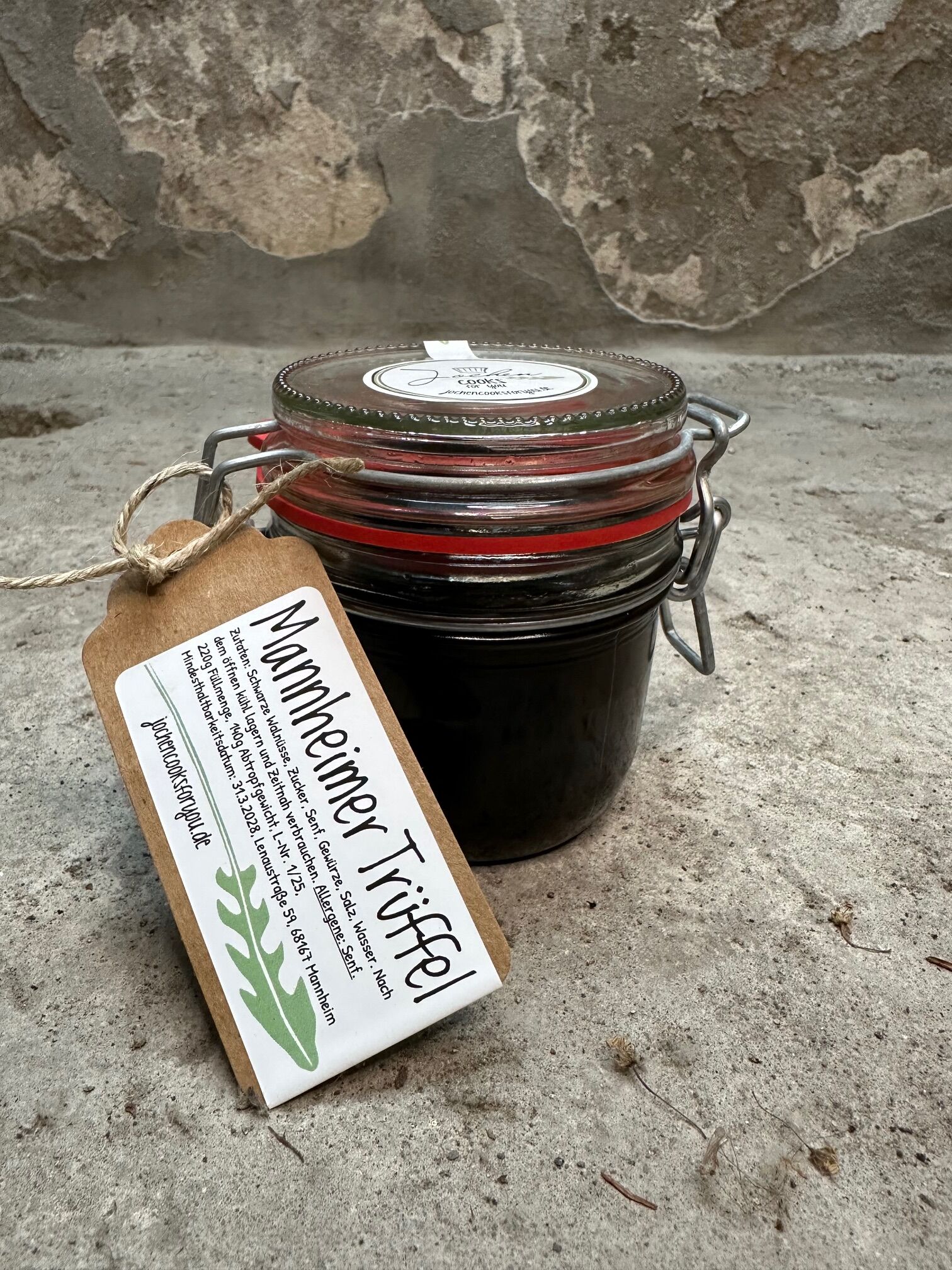 Über ein mehrere Wochen hinziehendes Verfahren werden die jungen grünen Walnüsse zu einer Delikatesse verarbeitet. Du kannst sie in dünne Scheiben schneiden und zum Käse servieren, oder auch als Kontrast zur süßen Nachspeise garnieren. Man kennt sie auch als schwarze Walnüsse. Ich nannte sie Mannheimer Trüffel, weil sie in Mannheim wachsen, dort verarbeitet werden und so fein wie Trüffel sind.
