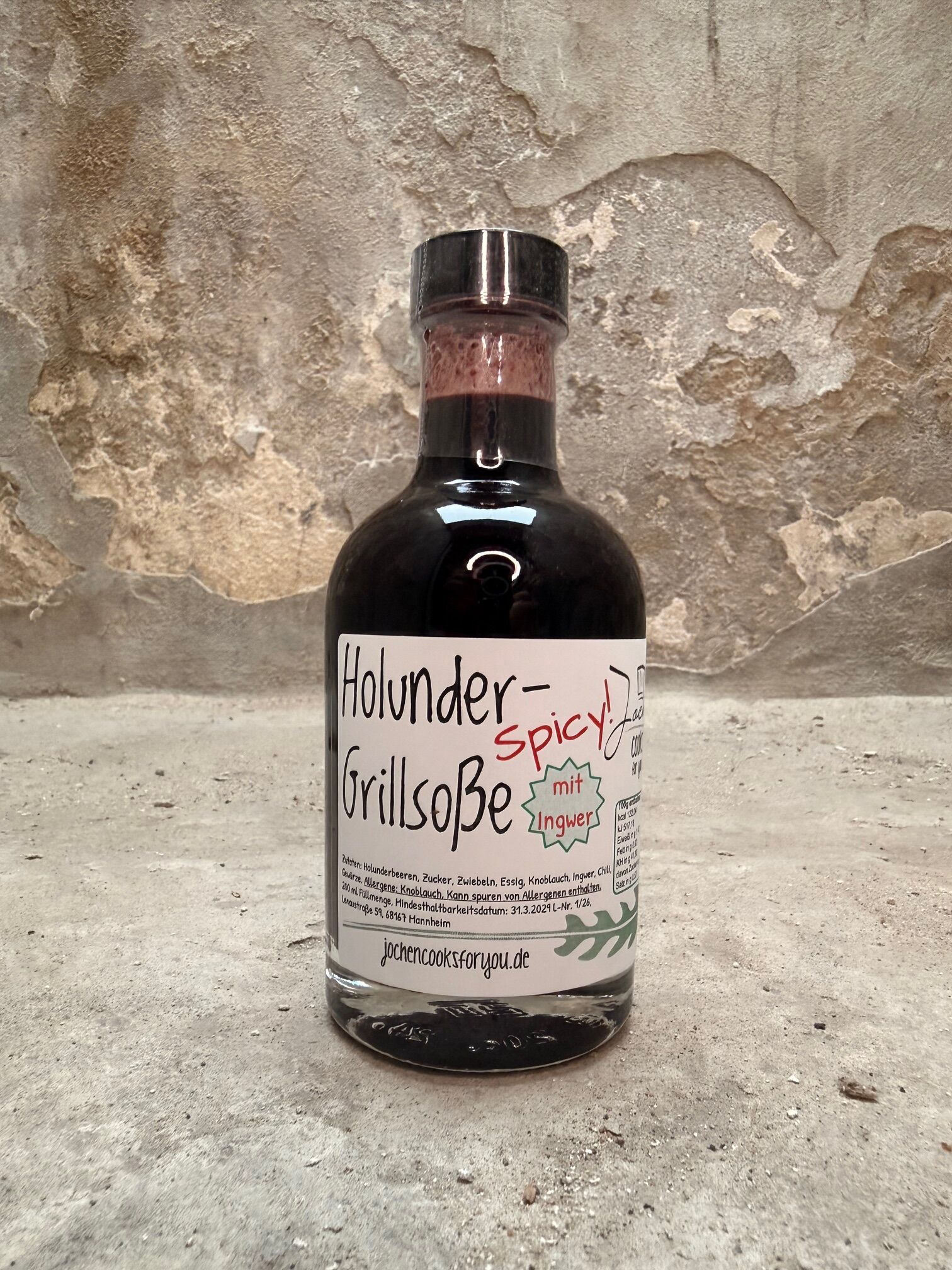 60 % Holunderbeeren, Zucker, Essig, Zwiebeln, Knoblauch, Ingwer, Salz, Gewürze, Chilipulver.